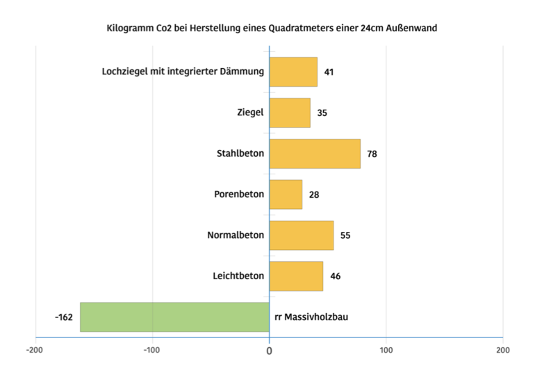 Beispielsweise entlastet eine 24cm starke Vollholzwand die Umwelt mit über 200kg CO2/m² gegenüber einer vergleichbaren Steinwand.